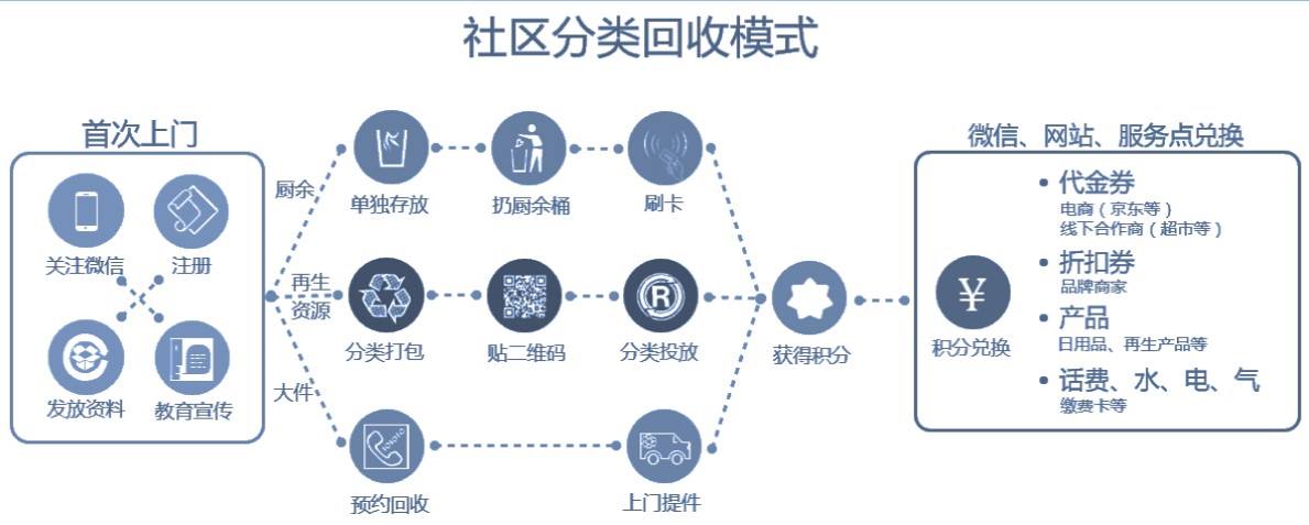 此外,在对垃圾分类回收至关重要的厨余垃圾分类环节,开通了有偿积分回收渠道。同时,居民的可回收废品也通过该平台换算成积分,居民账户里的积分可在线兑换生活用品、电话卡、购物卡及现金等。