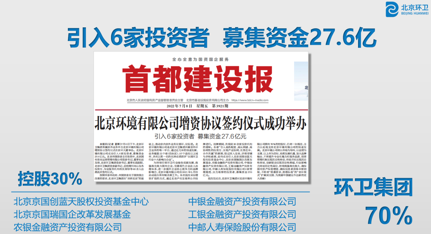 北今年会境有限公司作为京外环卫业务唯一平台,业务已覆盖21个省(自治区)、46个县级以上城市,所属项目共计147个,公共空间清洁业务面积共计6.79亿平方米,固废收运业务总量679.17万吨,固废处理业务总量329.19万吨,为属地提供高品质环卫服务。2022年成功引入北京京国创蓝天股权投资基金中心等6家高匹配度、高认同感、高协同性的投资方,募集资金27.6亿元,实现产业协同、优势互补、合作共赢,进一步提升企业经营活力、市场影响力和核心竞争力。