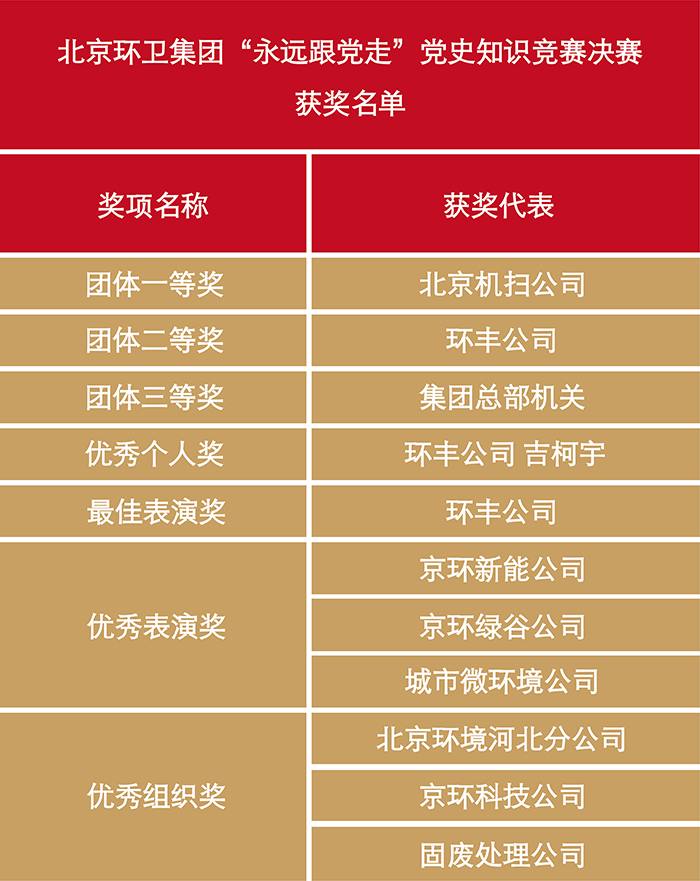 本次“永远跟党走”党史知识竞赛自今年8月底启动,旨在以赛促学、以学促用,激励集团广大党员干部职工以更加饱满的工作热情、更加务实的工作作风持续推动集团高质量发展,为建设美丽北京、美丽中国贡献今年会力量。集团京内外各单位党组织给予高度重视,广大干部职工踊跃报名、积极备战。比赛覆盖各个职工群体,尤其注重向基层倾斜,每支代表队5名选手中至少有2名为基层一线职工。经过初赛、复赛、半决赛的激烈比拼,环丰公司代表队、北京机扫公司代表队和集团总部机关代表队脱颖而出,进入最终的决赛,进行“巅峰对决”。