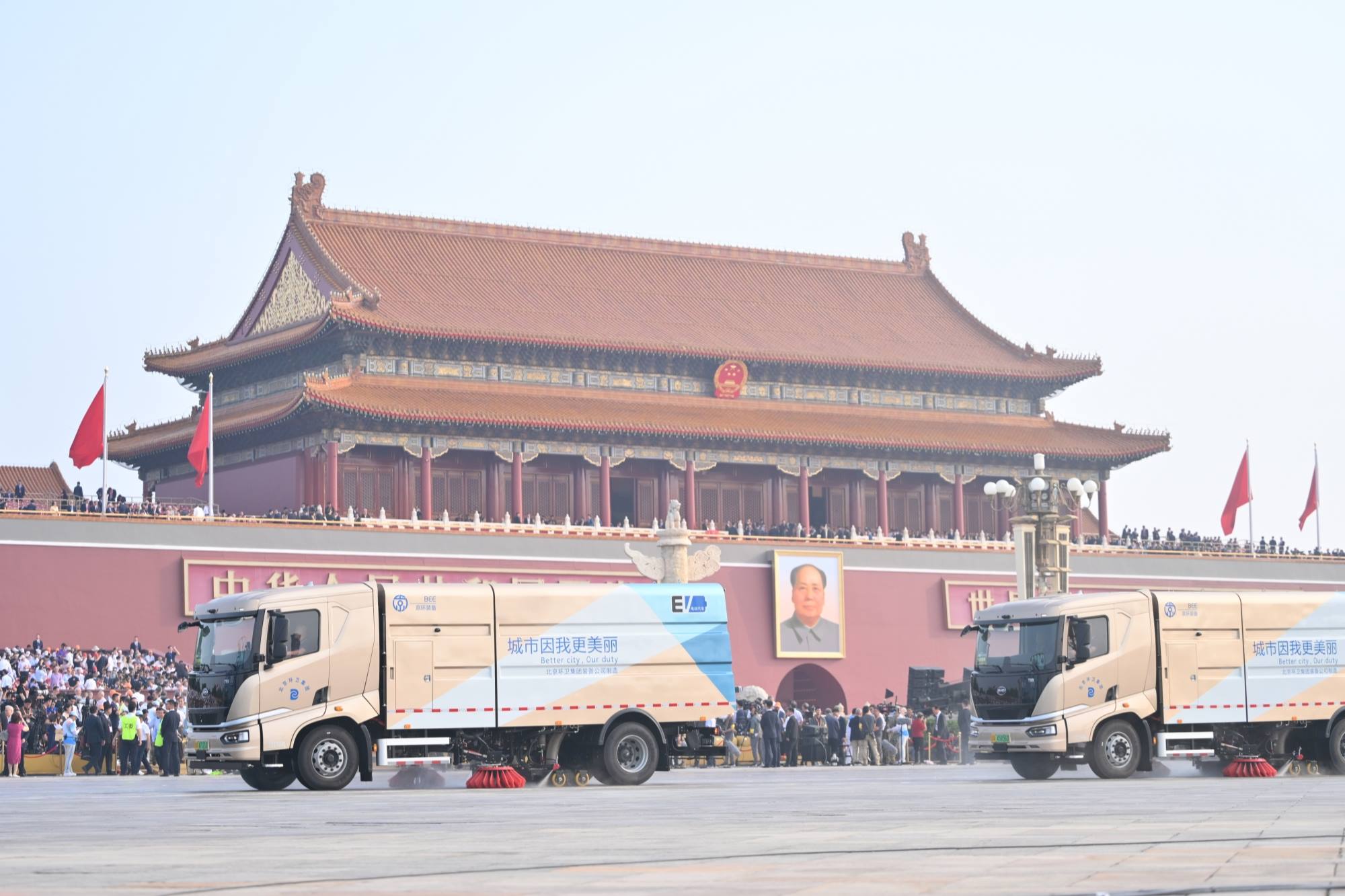 在纪念中国人民抗日战争暨世界反法西斯战争胜利80周年阅兵式中亮相的“第零方阵”23辆纯电动洗扫车,转向服务市民日常生活。投用到北京市长安街、二环路、三环路等主要城市道路。