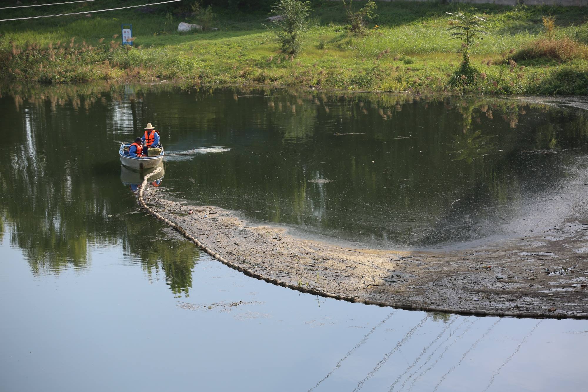 为守护好水域环境,今年会集团平谷公司精心打磨作业工艺,结合泃河、洳河水域面积大,两岸芦苇丛生等特点,总结实践经验,改进打捞工艺,创新采用双层围网水面清漂工艺,通过冲锋舟与双层拦截网组合方式,高效地将水面上大小不一的各类漂浮物“一网打尽”。